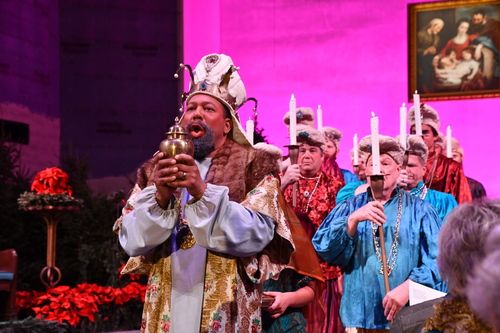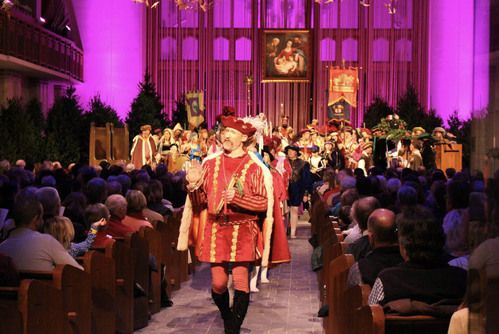 Adaptation is also a part of the tradition. At first, following the English custom, there were only men and boys in the cast, fifty in all. Consequently, in the war years of 1946 and 1946 the ceremony was reduced to a homily with the traditional music. From 1955 to 1956, while a new church was being built, the festival was held in the Masonic Temple. When the new church opened in 1957, the Boar’s Head processions were expanded to accommodate different aisles and entrances.