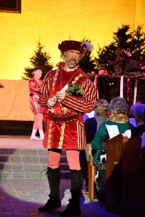 The pageant begins as a gong sounds the hour. The prelude, arranged from an English folk song, is based on “The Cherry Tree Carol” in which Jesus, from within the womb, changes a cherry tree to bend down its branches to Mary. Apocryphal stories like this were popular among traveling mendicant friars in the Middle Ages.